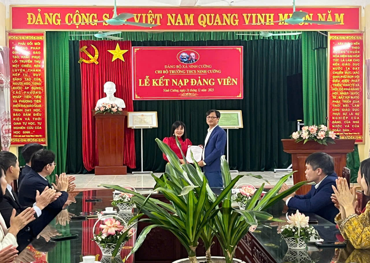 Thực hiện công tác xây dựng Đảng năm 2025, được sự quan tâm, chỉ đạo của Đảng ủy xã Ninh Cường, ngày 26/12/2025 tại Trường THCS Ninh Cường, các vị đại biểu và chi bộ nhà trường đã long trọng tổ chức Lễ kết nạp Đảng viên cho quần chúng ưu tú Nguyễn Thị Nga, hiện đang công tác tại nhà trường.