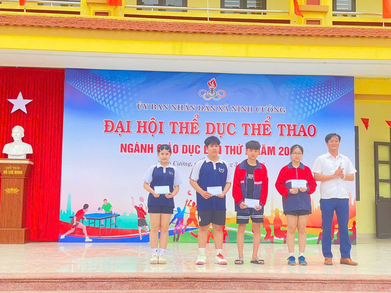 Tham gia Đại hội với tinh thần đoàn kết, trung thực và cao thượng, đoàn vận động viên Trường THCS Ninh Cường đã thi đấu hết mình, phát huy tốt năng lực, bản lĩnh và đạt được những thành tích rất đáng tự hào. Kết quả, nhà trường đã xuất sắc giành được 5 giải Nhất và 6 giải Nhì ở nhiều nội dung thi đấu như: điền kinh, nhảy cao, cờ vua, nhảy xa và bóng bàn.
